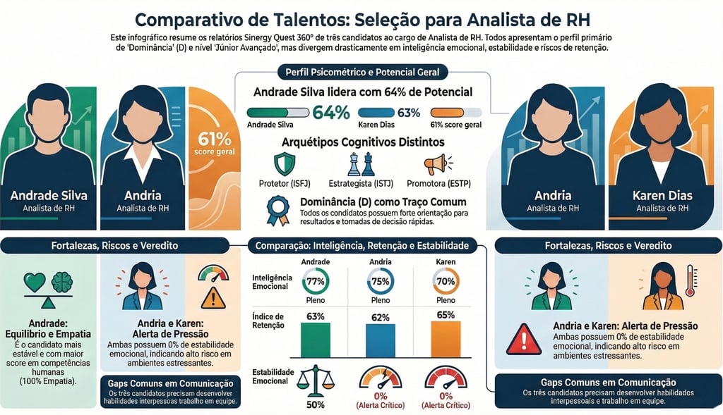 O uso do Sinergy Quest Profile 360° é essencial para que todos os seus processos seletivos — sejam eles internos ou externos — deixem de ser baseados em intuição e passem a ser guiados por dados precisos. Esta metodologia, ao mapear o potencial humano de forma profunda, é capaz de reduzir custos de rotatividade em até 40% e aumentar significativamente o engajamento das equipes.